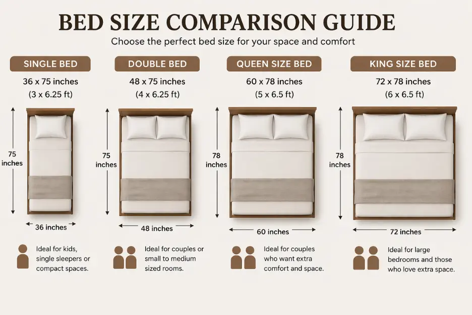 - Large rooms → Choose a king size bed or a premium Luxury Bed to create a grand and comfortable setup