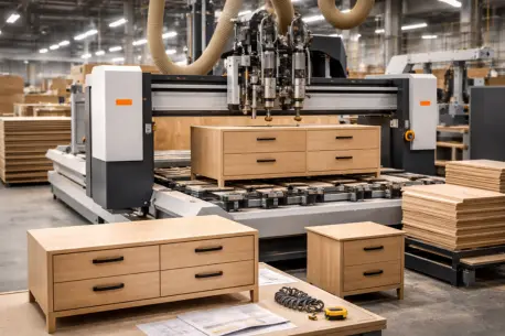 Machine-made furniture is produced in large factories where machines cut, shape, and assemble pieces automatically. Thousands of identical items are made very quickly. Many pieces come in flat boxes and are assembled at home. Because machines do most of the work, production costs remain low, making modern furniture widely affordable and easy to buy.