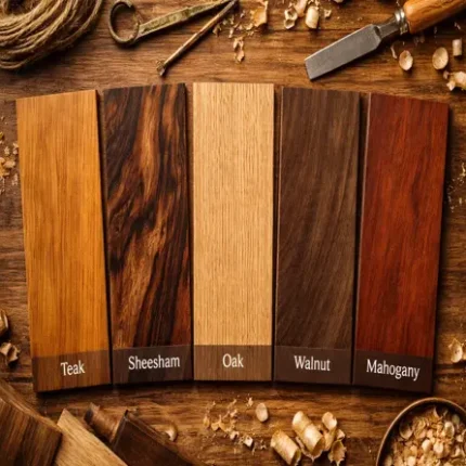 Handcrafted solid wood furniture is made from premium natural timber. Popular choices in India include Sheesham wood furniture – known for its rich grain and exceptional durability – along with teak wood furniture, oak, walnut, and mango wood.