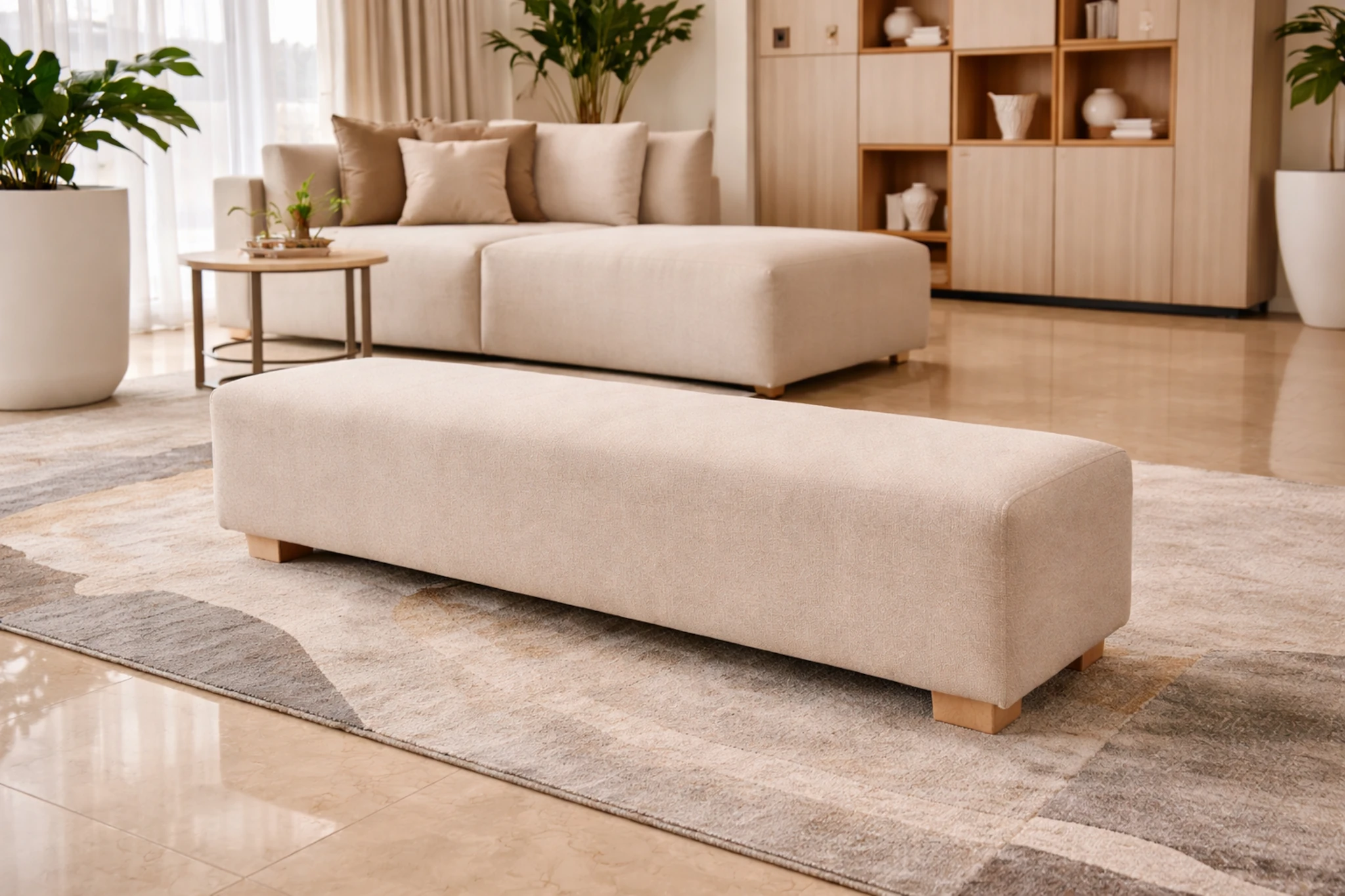 A refined upholstered bench with a clean, elongated form and subtle detailing, designed to bring quiet comfort and balance to a range of interior settings.