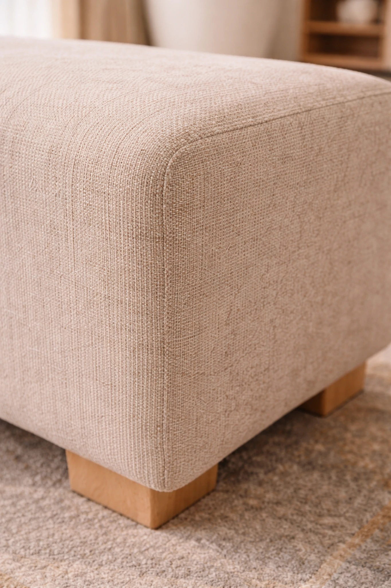 Upholstered in a finely textured fabric, Ansel offers a balanced tactile experience that feels considered and inviting. The clean upholstery lines and subtle corner detailing highlight the precision of the form, while the low, solid stance keeps the overall expression grounded. Timber block feet add warmth and visual weight, lifting the bench just enough to give it clarity and definition within a room.