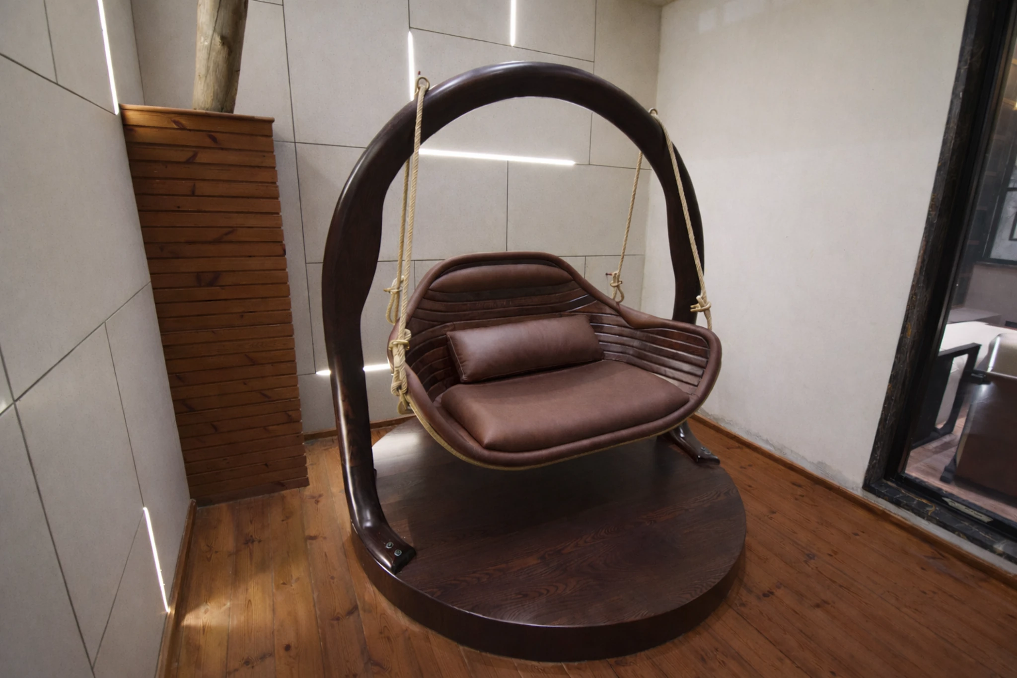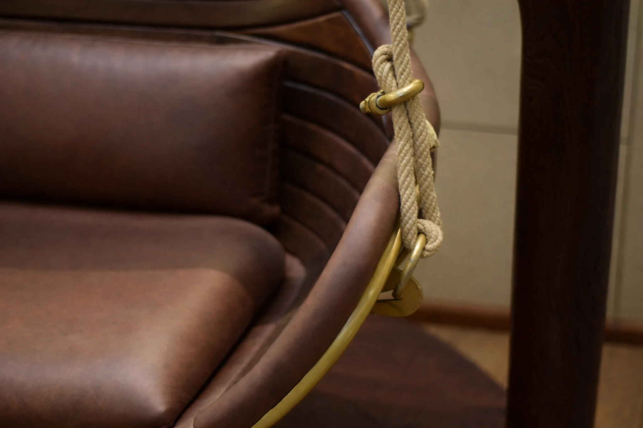 A sculpted suspended chair framed by a sweeping wooden arch and grounded on a solid circular base. Layered wooden slats and plush leather cushions create a cocooned, supportive seat, while rope and brass-finished details add subtle character. Designed as both a statement piece and a personal retreat within a space.