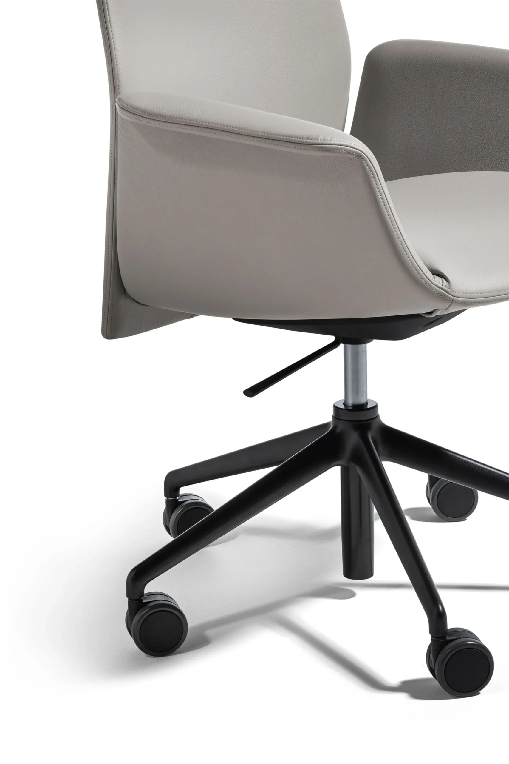 The upholstered shell wraps the body with subtle support, creating a seated experience that feels relaxed without appearing informal. Smooth transitions between backrest, arms, and seat emphasise continuity in the design, while the restrained profile ensures the chair remains visually light within the room. Elara is shaped to support long hours of focused work without relying on overt mechanisms or visual clutter.