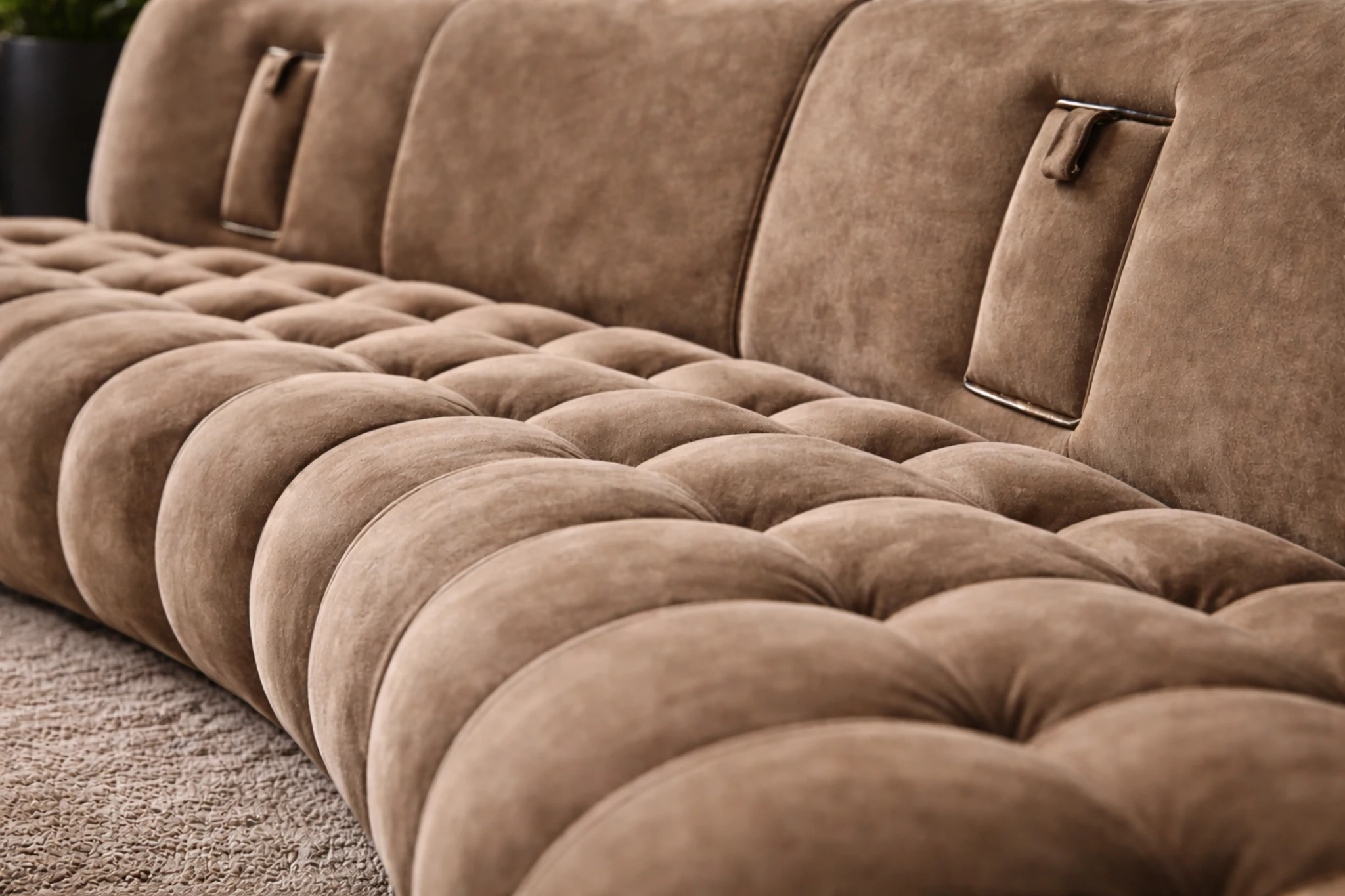 Deep channel tufting runs seamlessly across the seat and back, adding rhythm and depth while maintaining a refined profile. The proportions are generous without feeling bulky, offering a supportive yet inviting sit. Subtle detailing along the back introduces both visual interest and functional nuance, while the low base keeps the composition grounded and architectural.