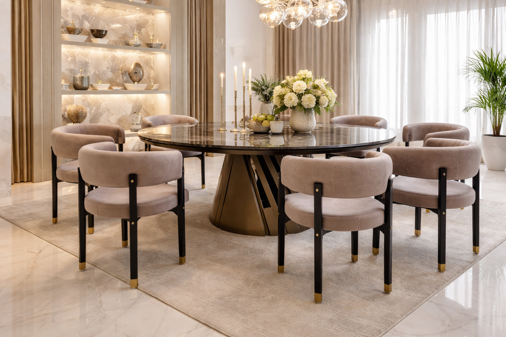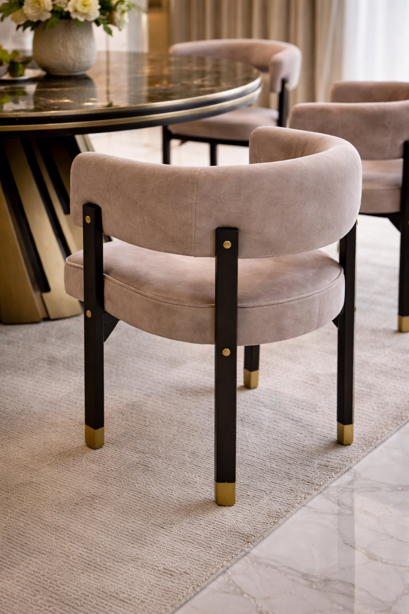 Halo Dining Chair is defined by its soft geometry and composed presence, designed to complement the dining setting without visual weight. The gently curved backrest forms a continuous embrace, creating a sense of enclosure while maintaining an open, refined profile. Its proportions are carefully balanced to feel substantial yet light, allowing the chair to sit comfortably around the table without crowding the space.