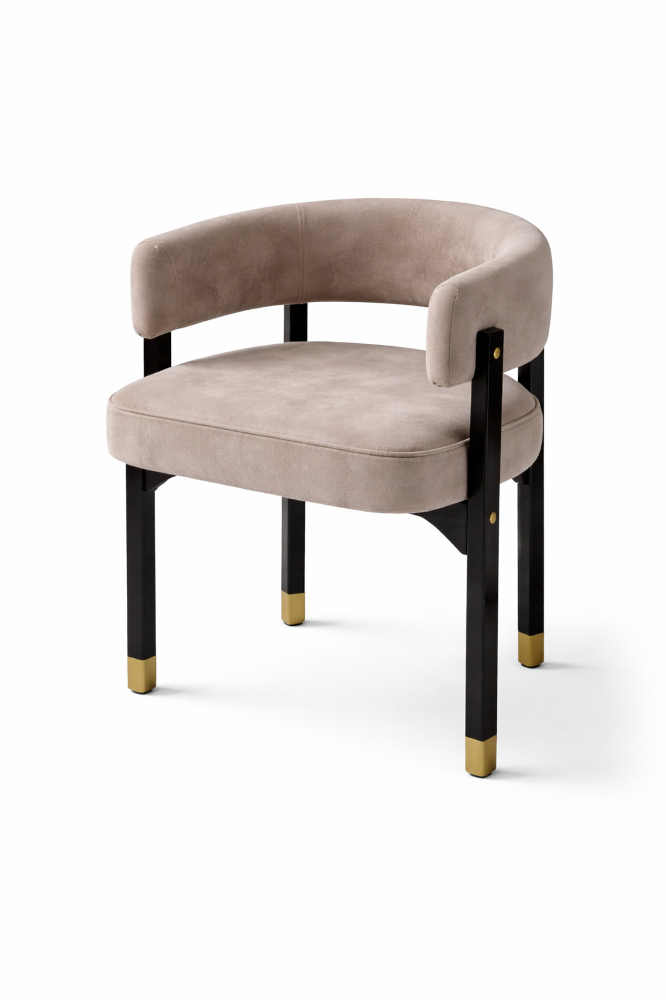 Upholstered surfaces and rounded transitions give the chair a calm, tactile quality, encouraging extended seating without excess cushioning or ornamentation. The structure is grounded by slender legs that provide visual contrast and stability, reinforcing the chair’s quiet architectural character. Every element is resolved with restraint, allowing material and form to speak clearly.