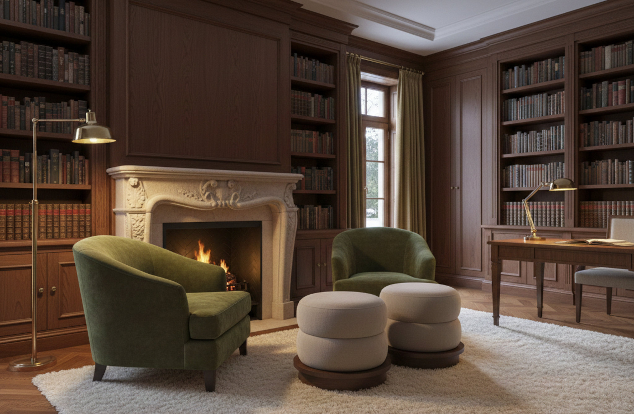 Soft upholstery and carefully considered proportions give the piece a composed presence. The rounded profile encourages flexibility in placement, allowing it to function naturally as part of a seating arrangement or as a standalone element within a room. Every line is intentional, contributing to a silhouette that feels calm and resolved.