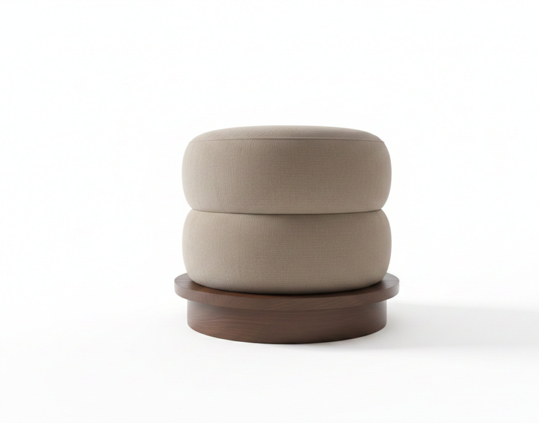 A compact, upholstered ottoman with a softly rounded form, designed to complement lounge settings with quiet balance and versatility.