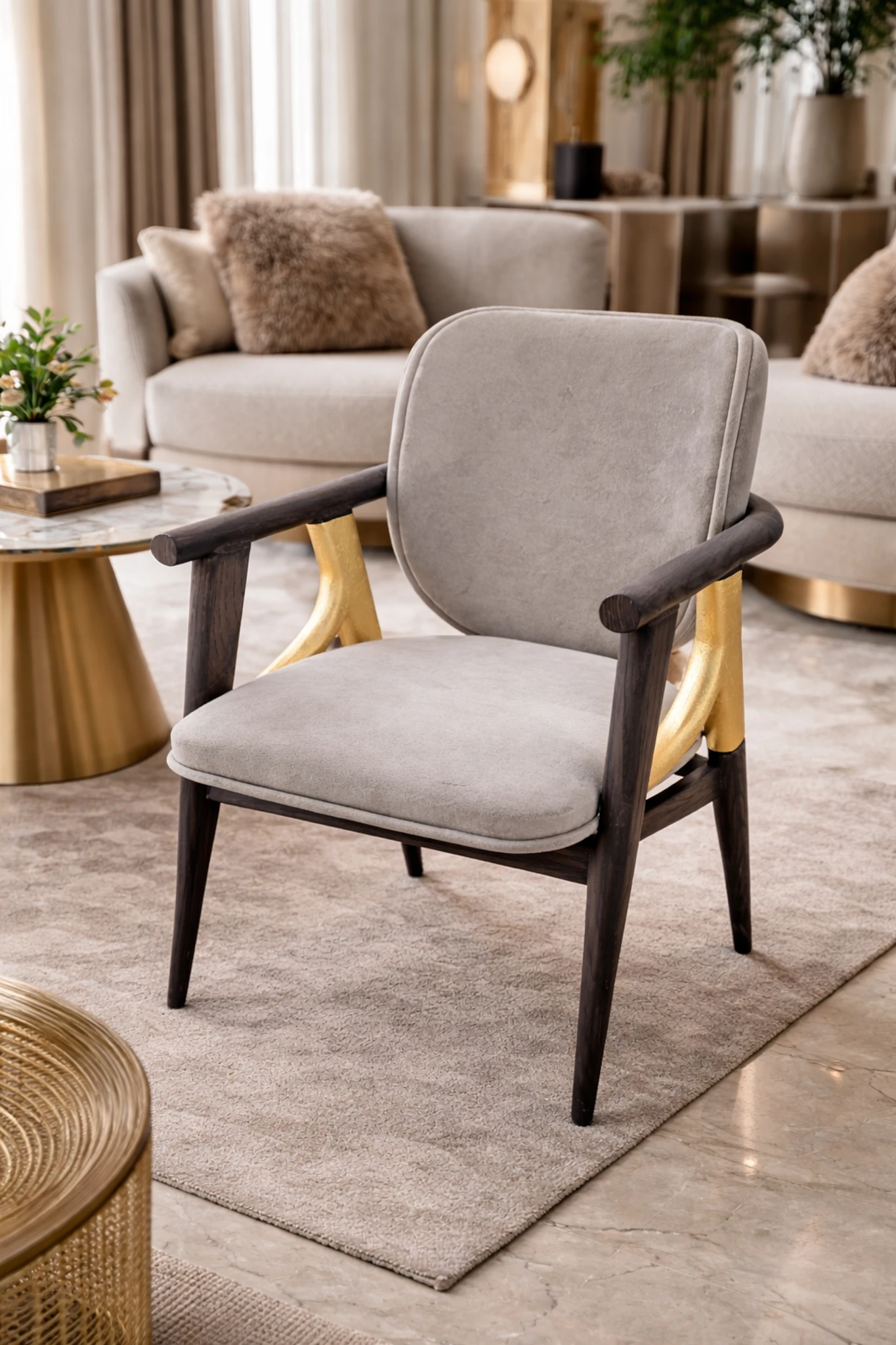 A sculpted wood frame with gold toned detailing defines the Lior Armchair, paired with soft upholstery for balanced comfort. Refined and distinctive, it brings warmth and character to any setting.