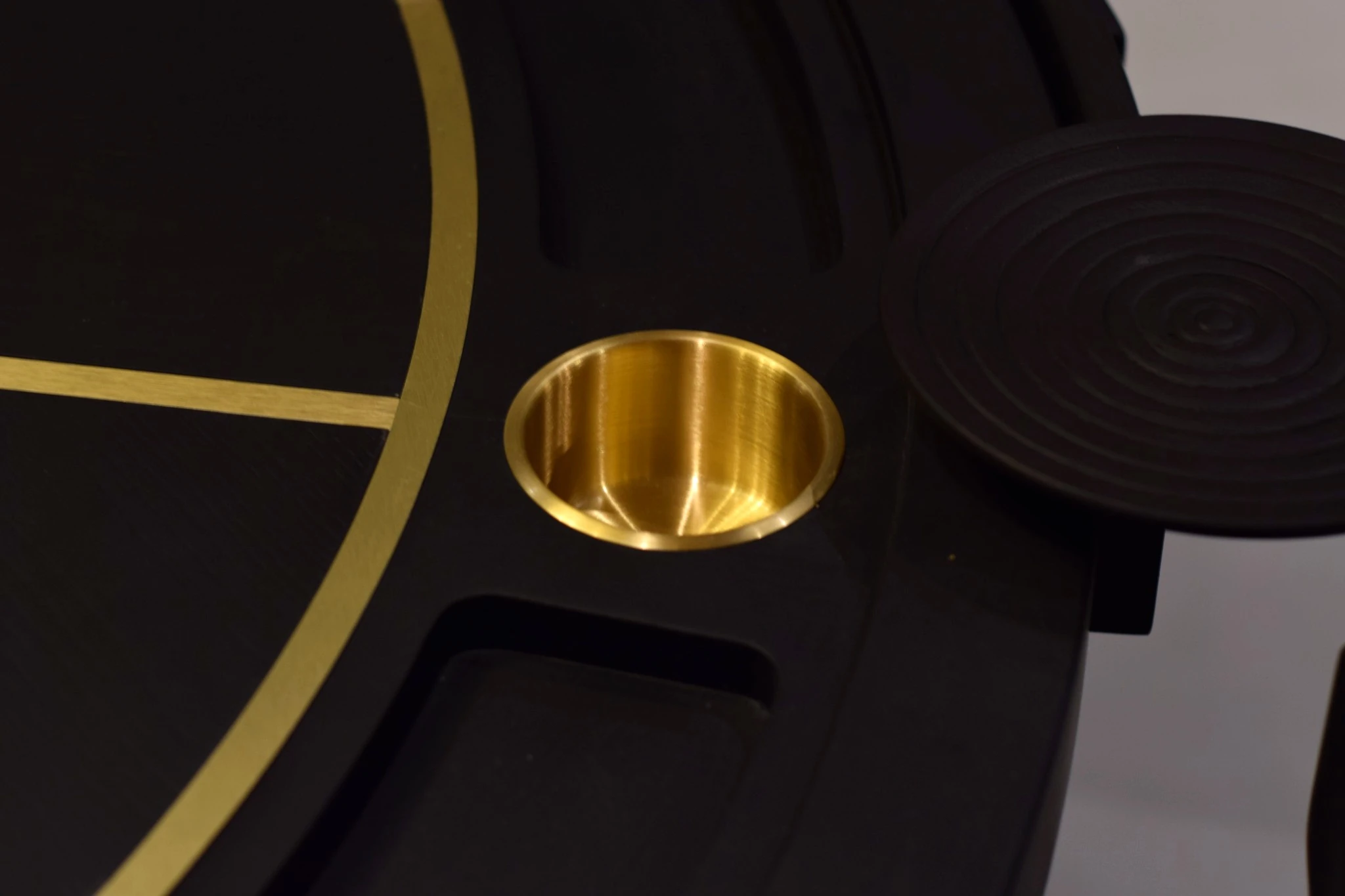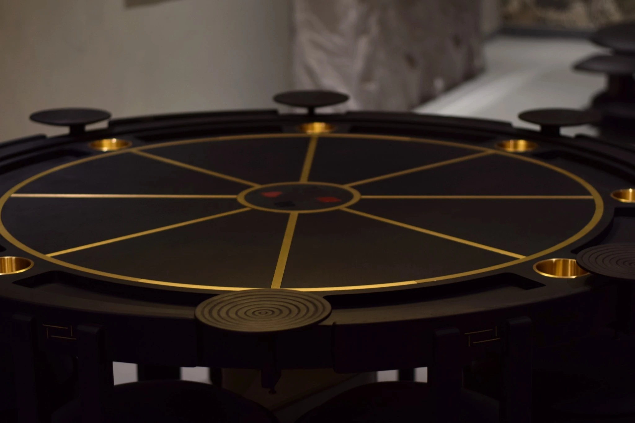Crafted in solid wood with a deep, matte finish, the table is accented with brushed brass cup holders seamlessly integrated into the perimeter. Individual player stations are subtly articulated, with raised circular platforms and recessed detailing that enhance both functionality and visual depth. Every element feels considered, from the proportional overhang to the weight and stance of the base.