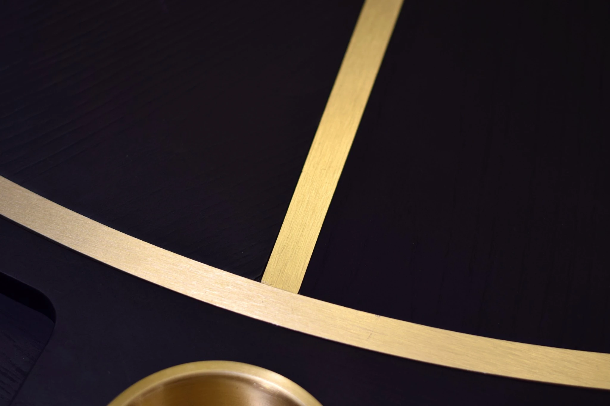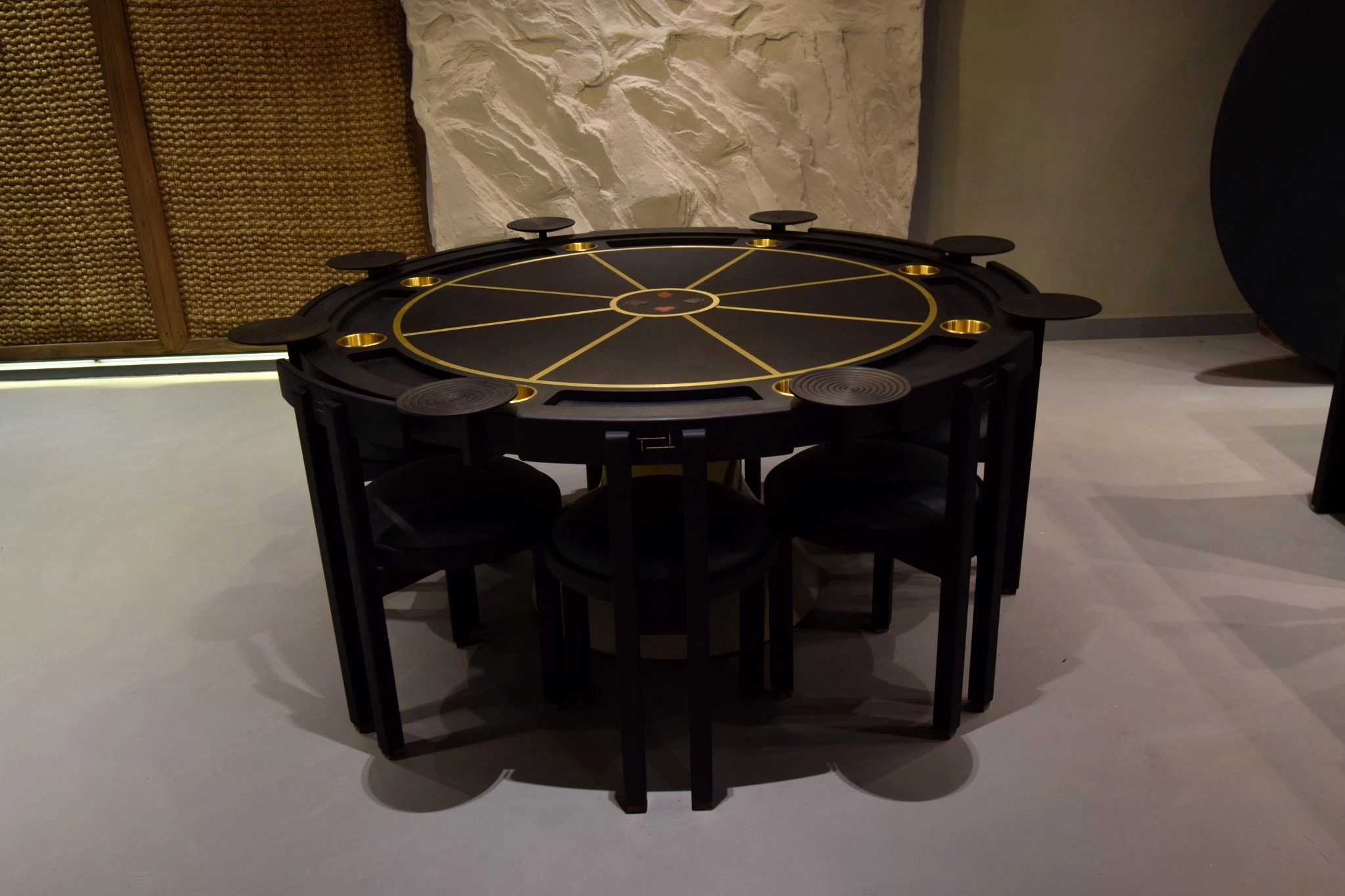 Meridian Poker Table is defined by balance, precision, and presence. Its circular form is structured by radial brass inlays that extend from a central point, creating a composed visual rhythm across the dark timber surface. The geometry is deliberate, echoing meridian lines that divide a sphere with clarity and order, giving the table a strong architectural identity rather than a decorative one.