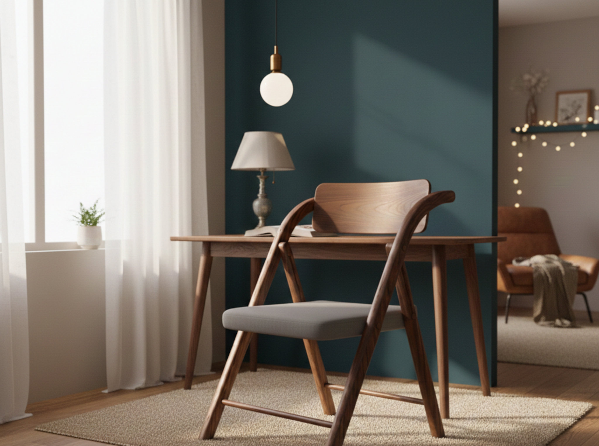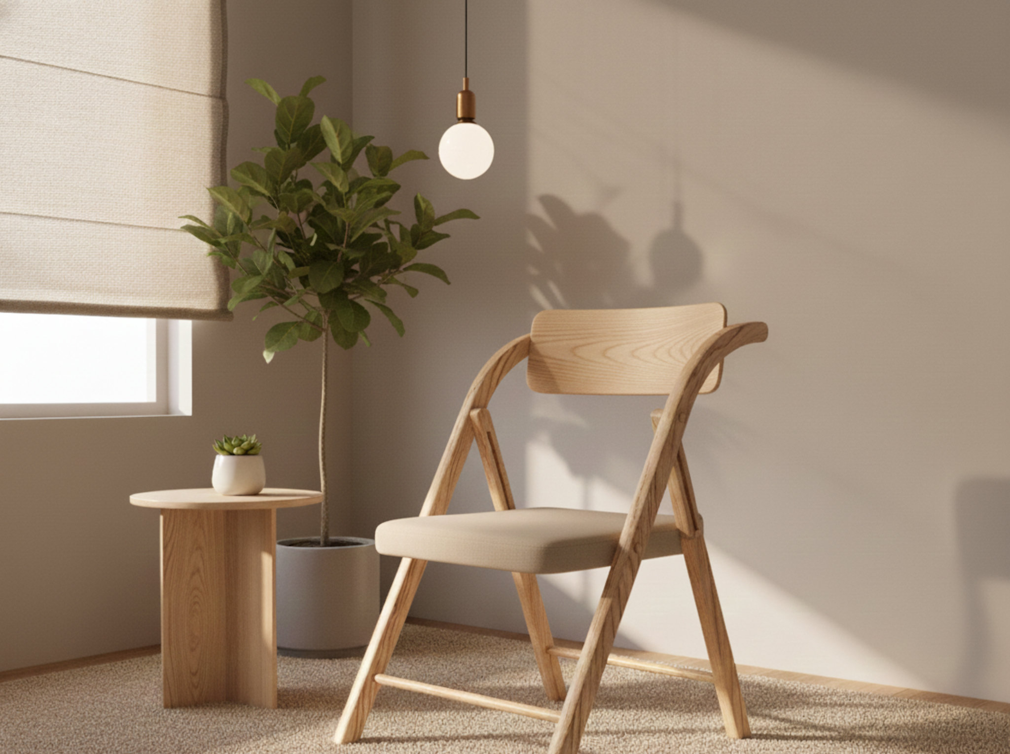 A solid wood folding chair designed for comfort and flexibility. Features a cushioned seat, ergonomic wooden backrest, and a space saving form suited to modern living.