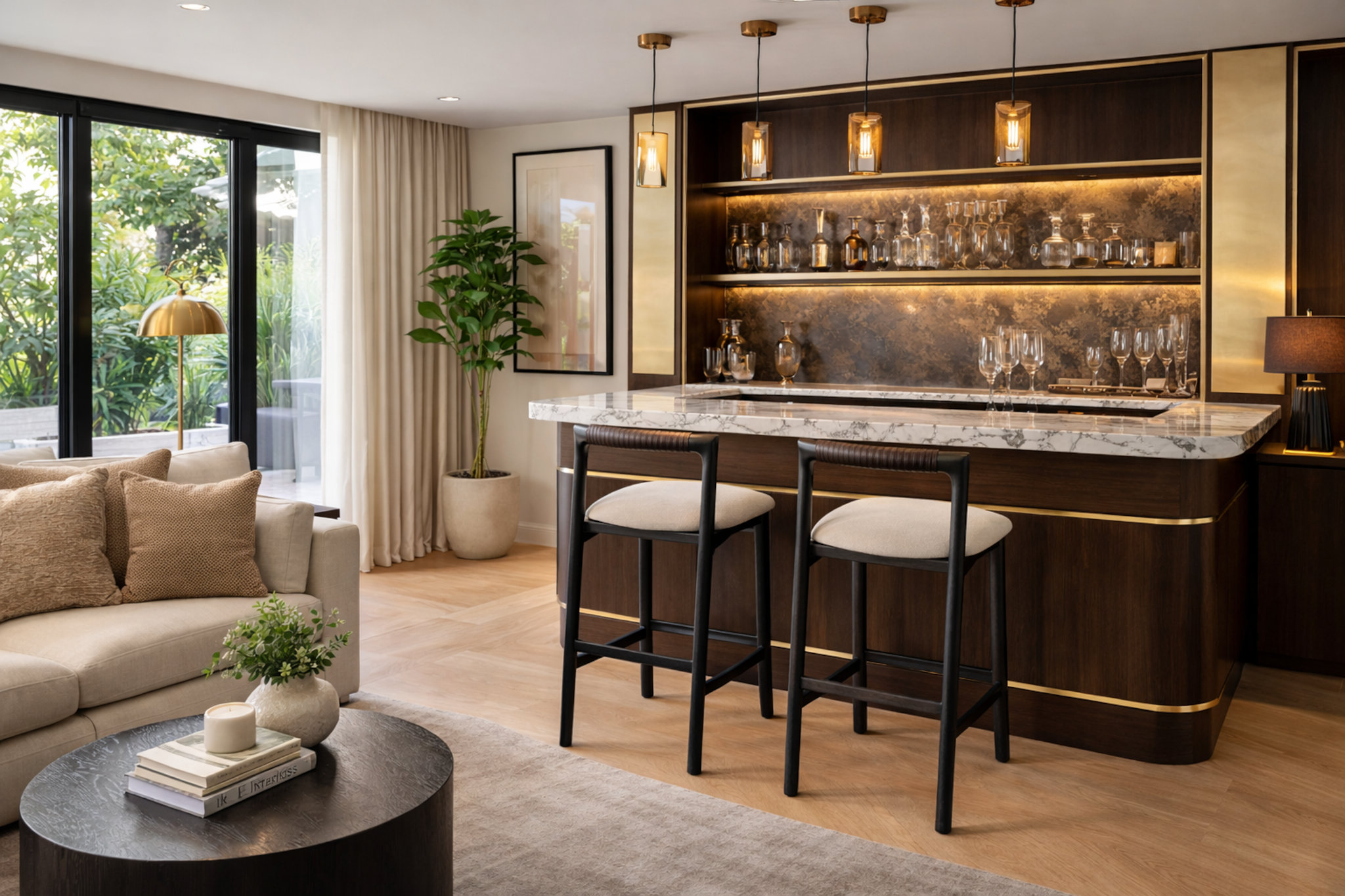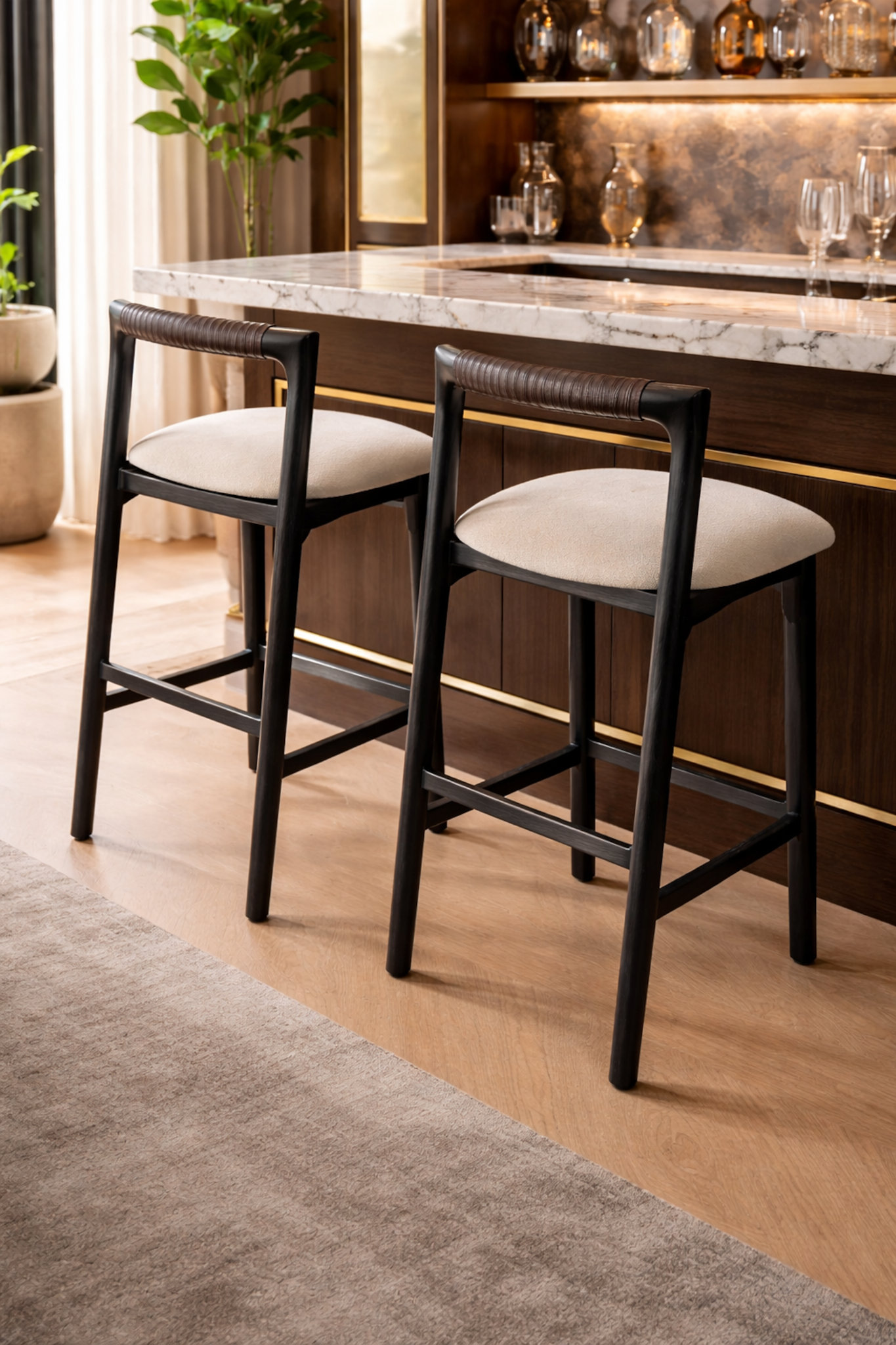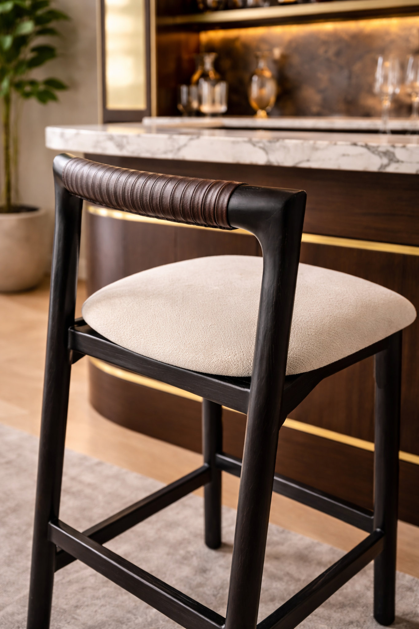 A restrained barstool defined by dark timber, subtle leather detailing, and balanced proportions. Designed for comfort and visual calm, it brings quiet confidence to kitchen islands and bar settings.