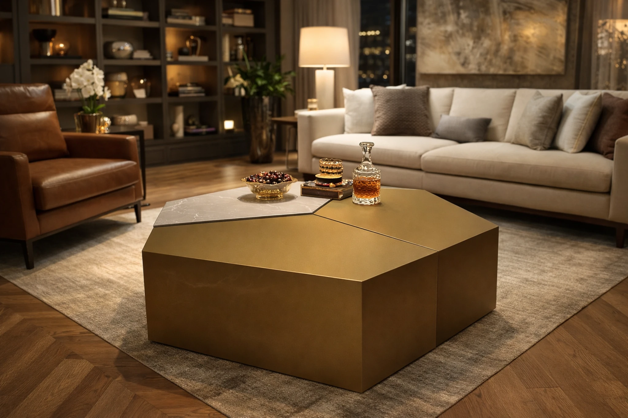 Pentra Lounge Table is defined by its bold geometry and grounded presence. Inspired by the clarity of faceted forms, its pentagonal silhouette introduces structure without excess, creating a sculptural focal point within the living space. The angled planes converge with precision, giving the table a sense of intentionality and quiet strength.