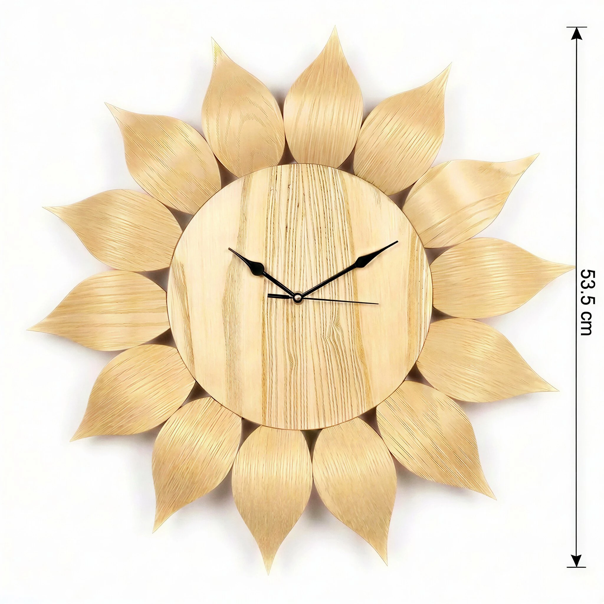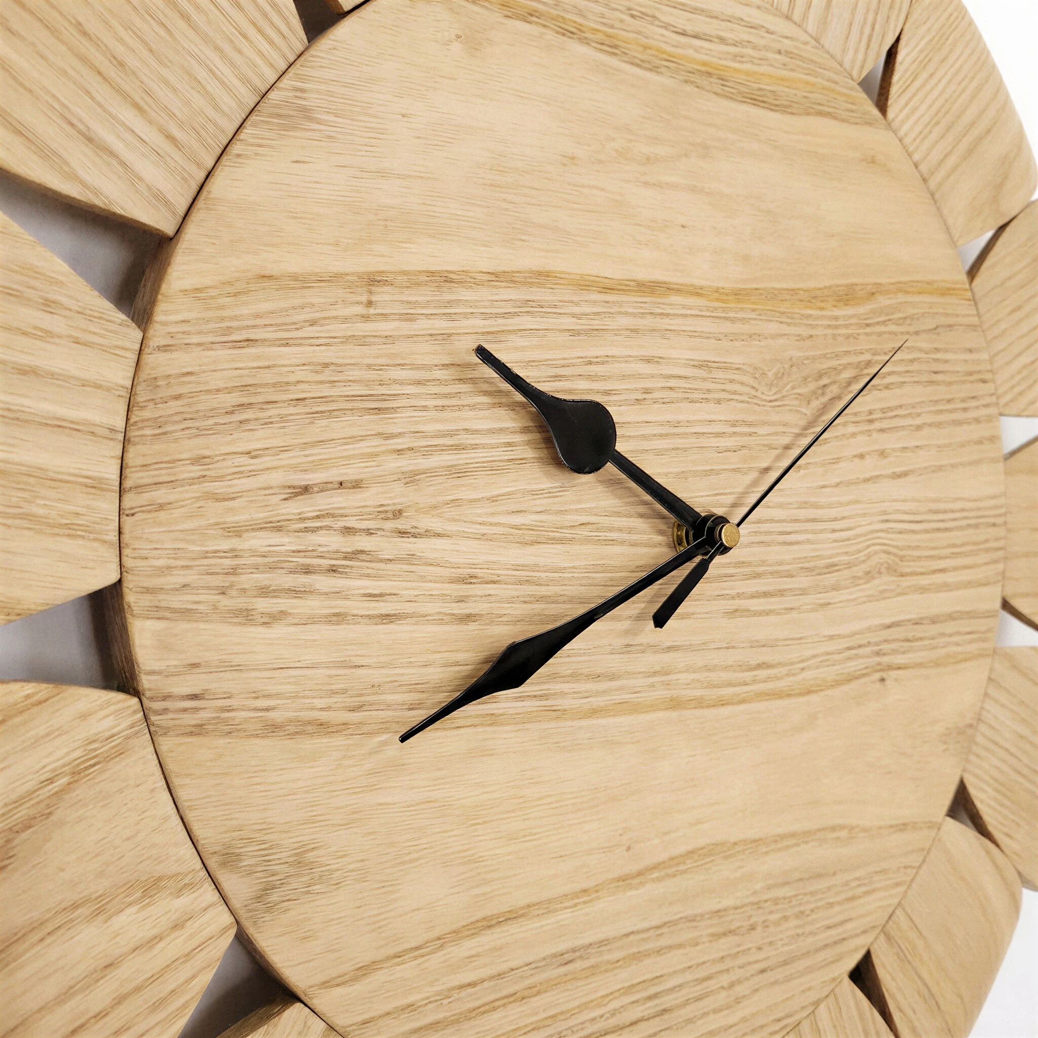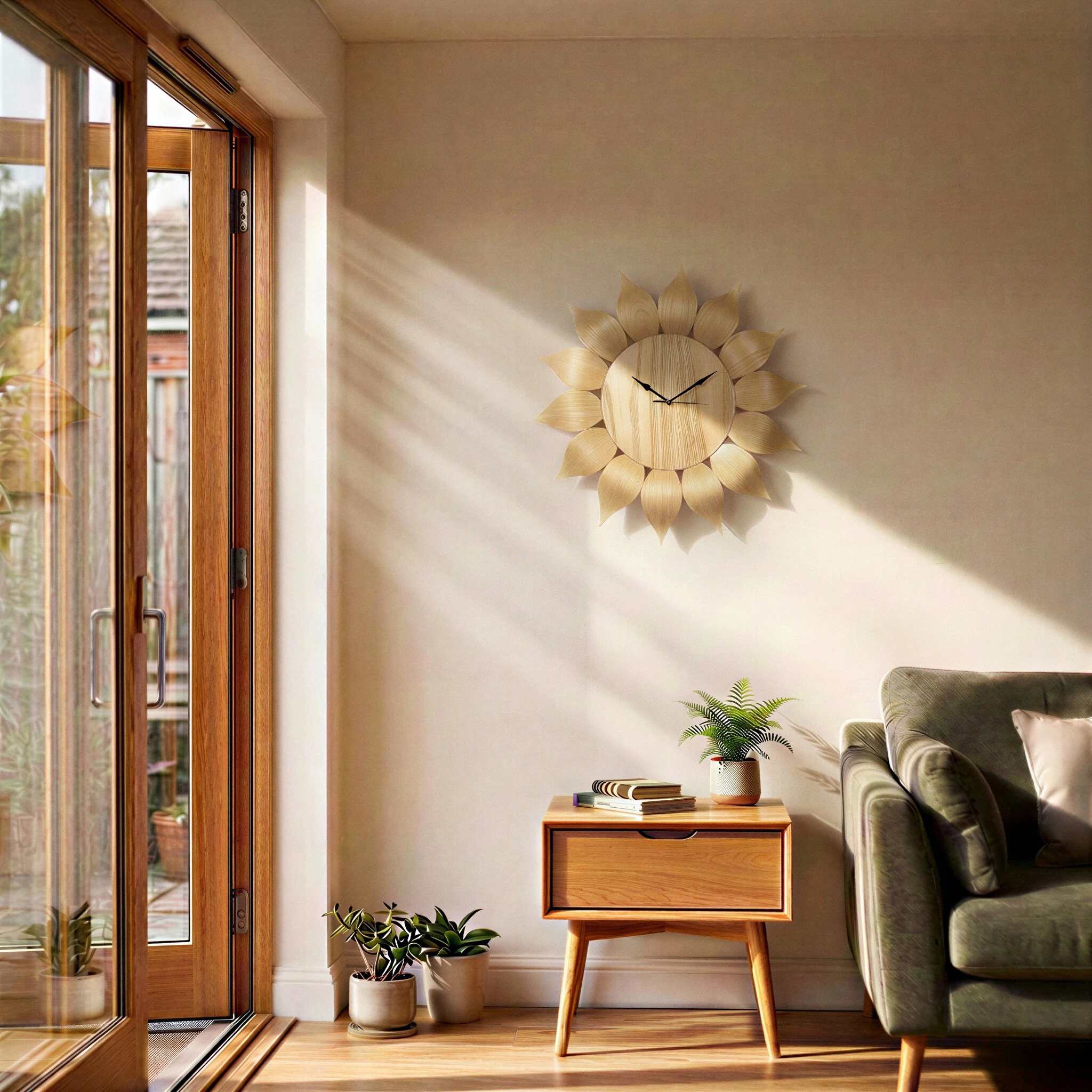 The Petals Wall Clock is composed as a radial arrangement of wooden elements, where each petal extends outward from a clean central dial. The repetition of form creates a sense of rhythm, while the softness of the edges keeps the overall presence calm and balanced. It sits comfortably between object and wall art, holding visual weight without overwhelming the space.