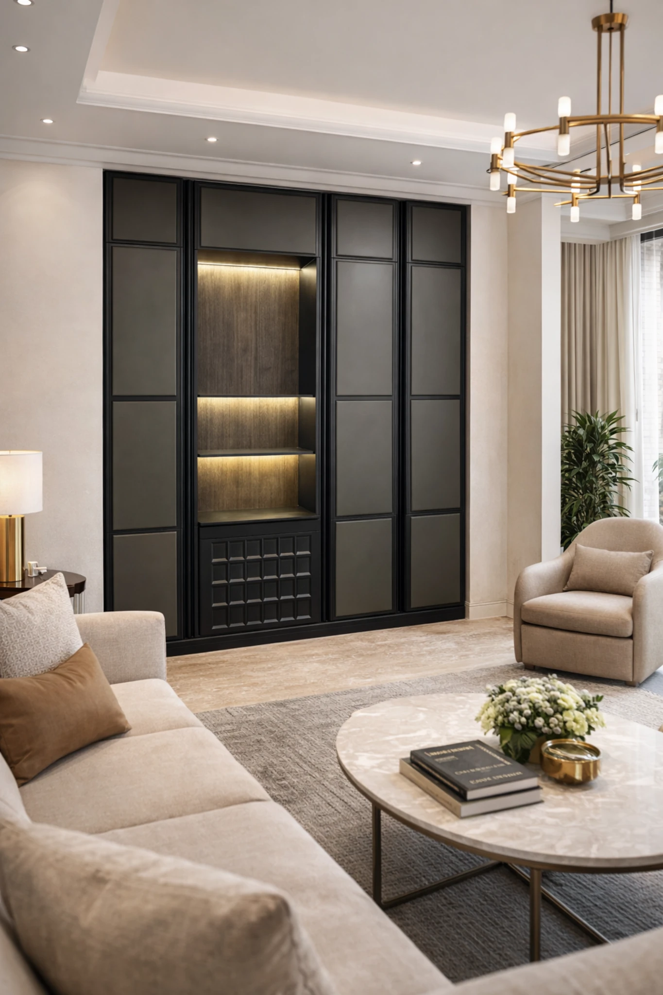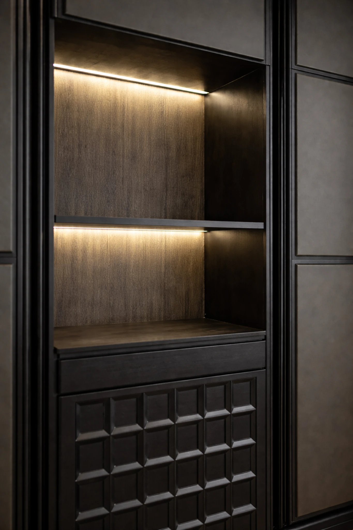 Materiality is handled with restraint. Dark toned surfaces and subtle textural contrast allow the cabinet to sit comfortably within both residential and professional settings, while integrated lighting adds warmth and dimension. The geometry is balanced and precise, lending the piece a calm authority that complements modern interiors without dominating them.