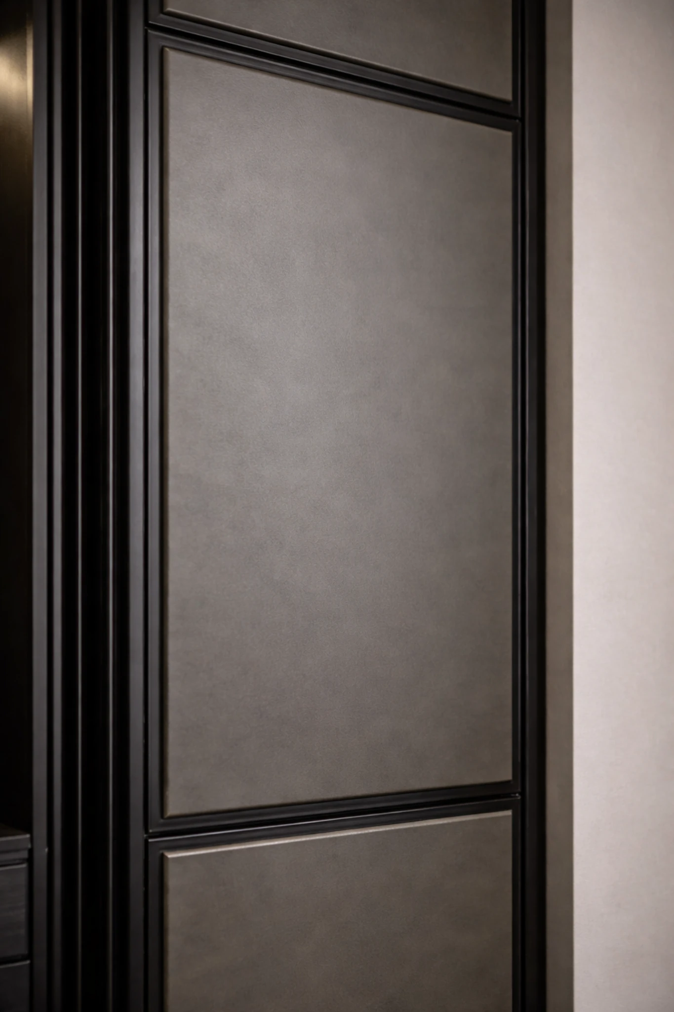 An architectural office cabinet defined by clean paneling, integrated lighting, and a composed, understated presence that brings order and quiet sophistication to the space.
