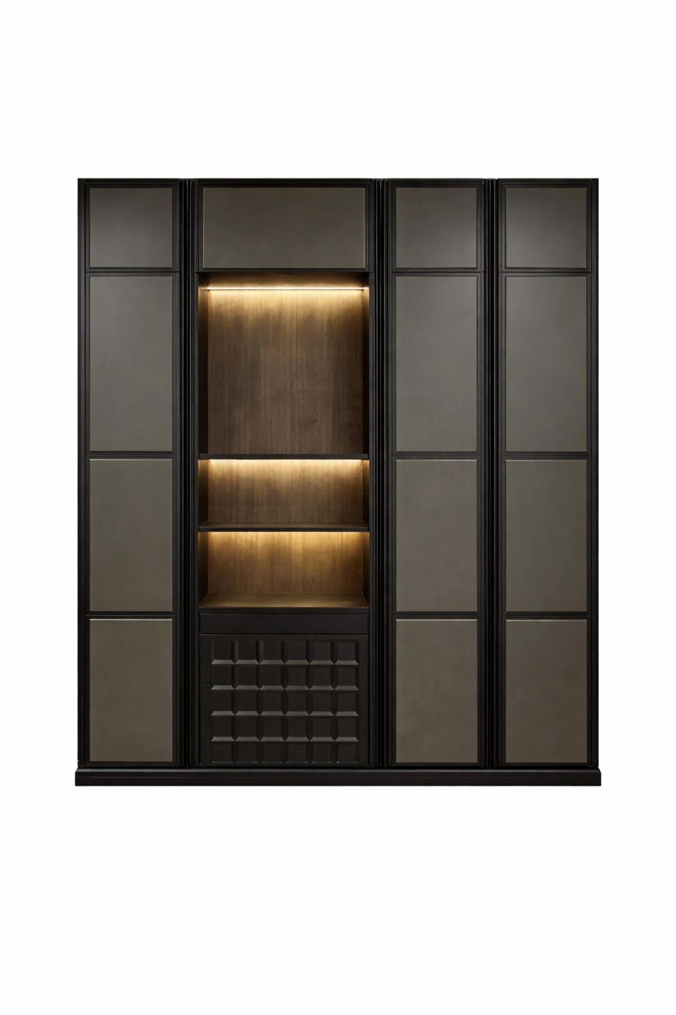 Plenum Office Cabinet is conceived as a quiet architectural presence rather than a conventional storage unit. Its elevation is defined by clean panel divisions and strong vertical framing, creating a sense of order and rhythm that feels deliberate and composed. The central recessed bay introduces visual depth, softly illuminated to break the mass and give the cabinet a focal point without excess ornamentation.