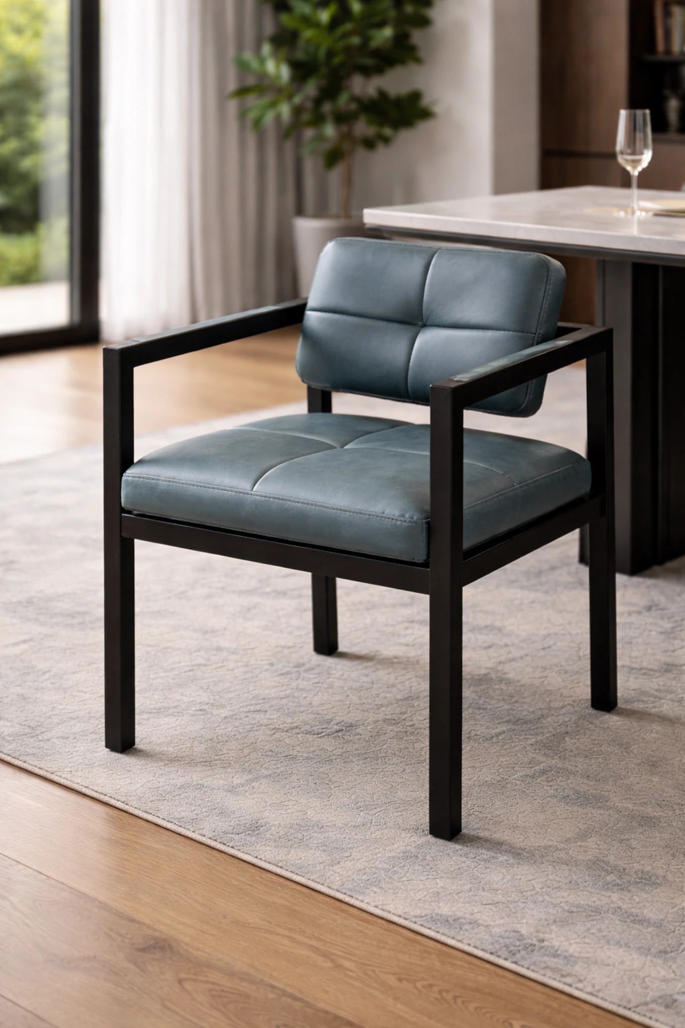 Designed for modern dining settings, the chair offers supportive comfort without visual heaviness. The squared backrest sits slightly reclined for ease, while the upholstered seat provides a firm yet comfortable foundation for extended meals and conversations. The arm frame flows seamlessly into the legs, reinforcing the chair’s strong, grounded presence.