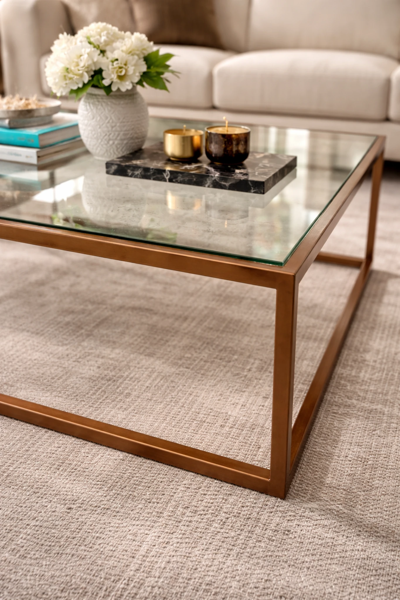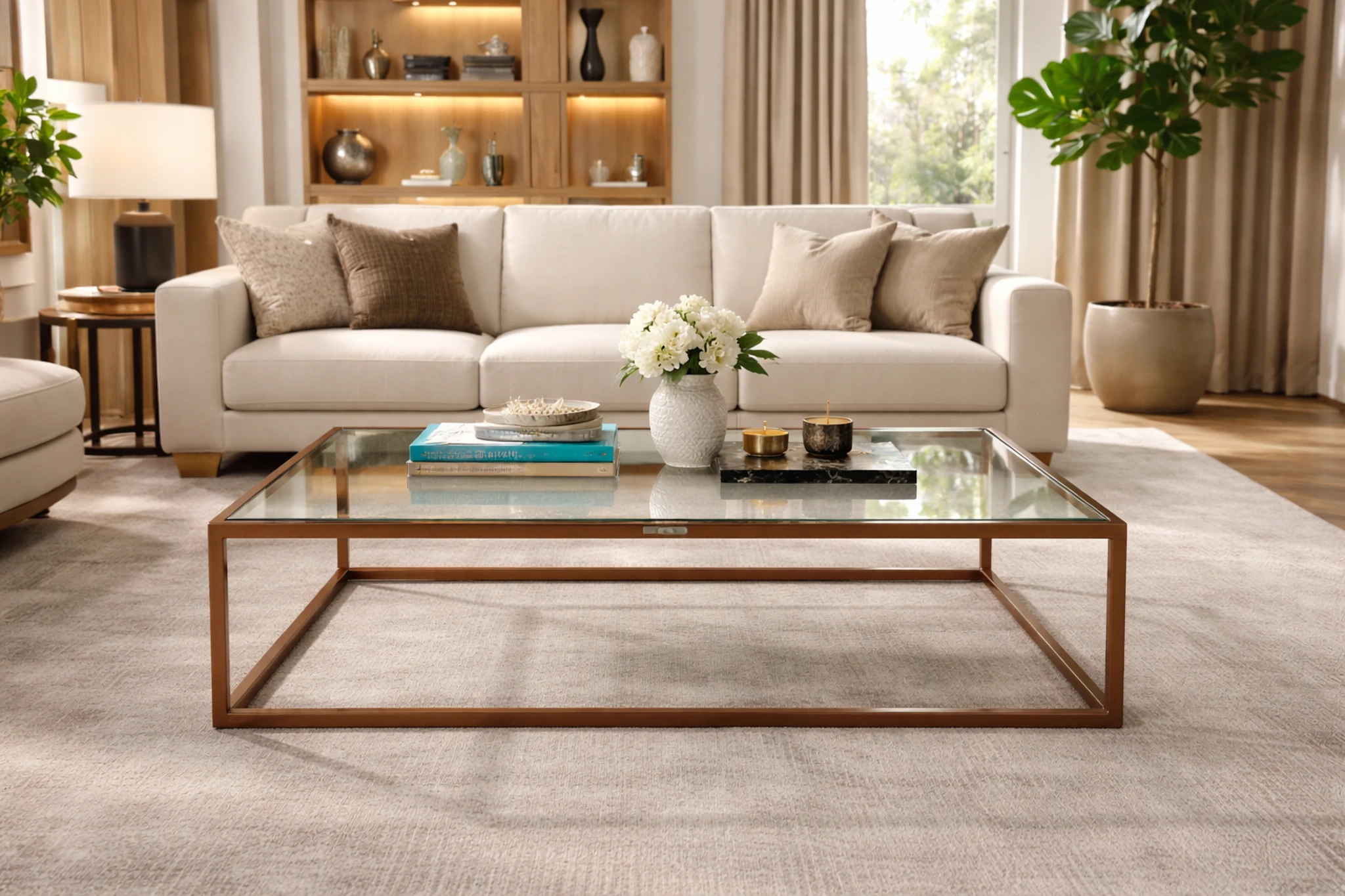 A clean, architectural lounge table with a slim metal frame and clear glass top, designed to keep the space visually open while grounding the seating area with quiet structure and balance.