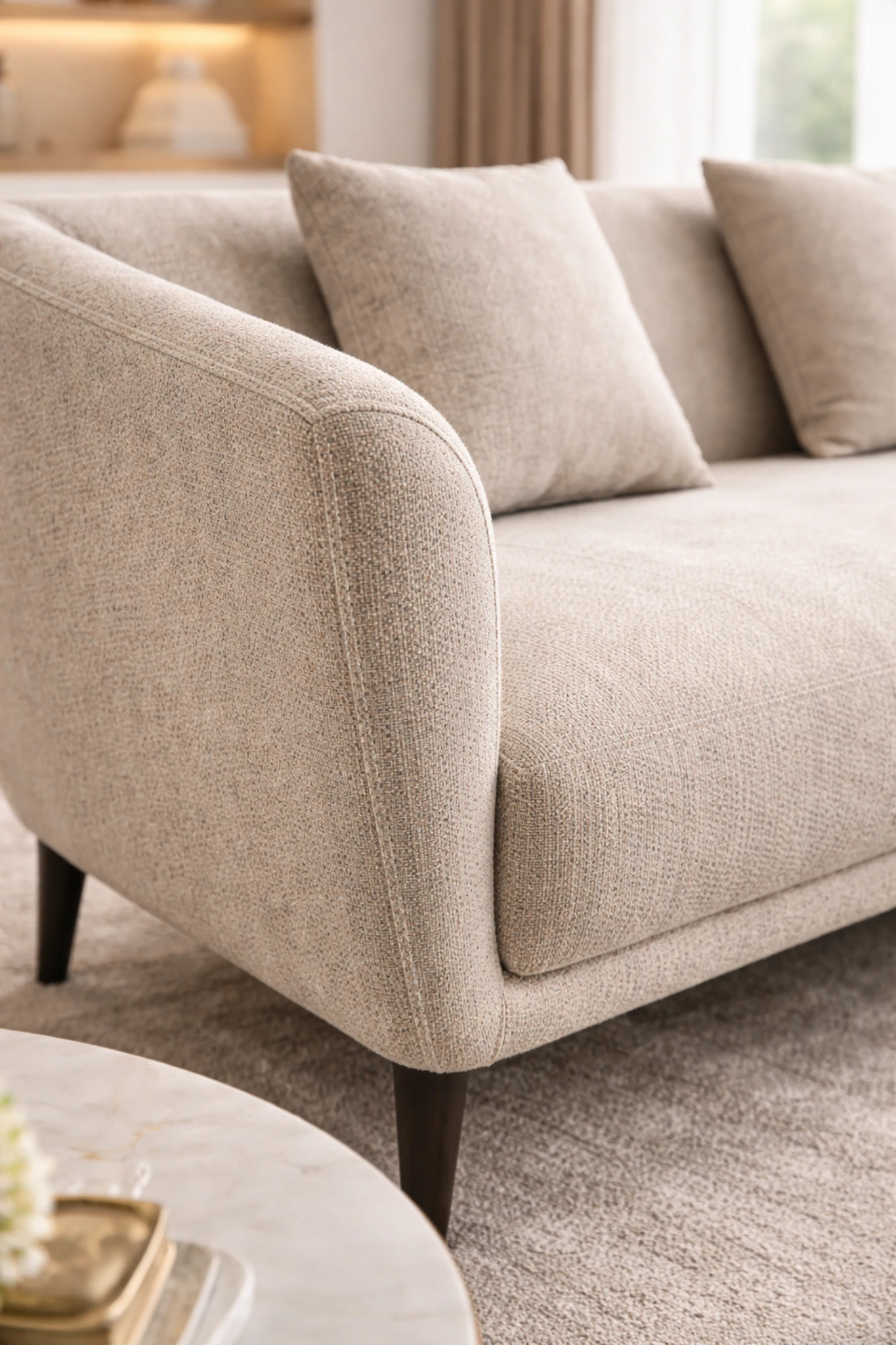 A composed sofa with softened lines and balanced proportions, designed to bring quiet calm and everyday comfort to living spaces.