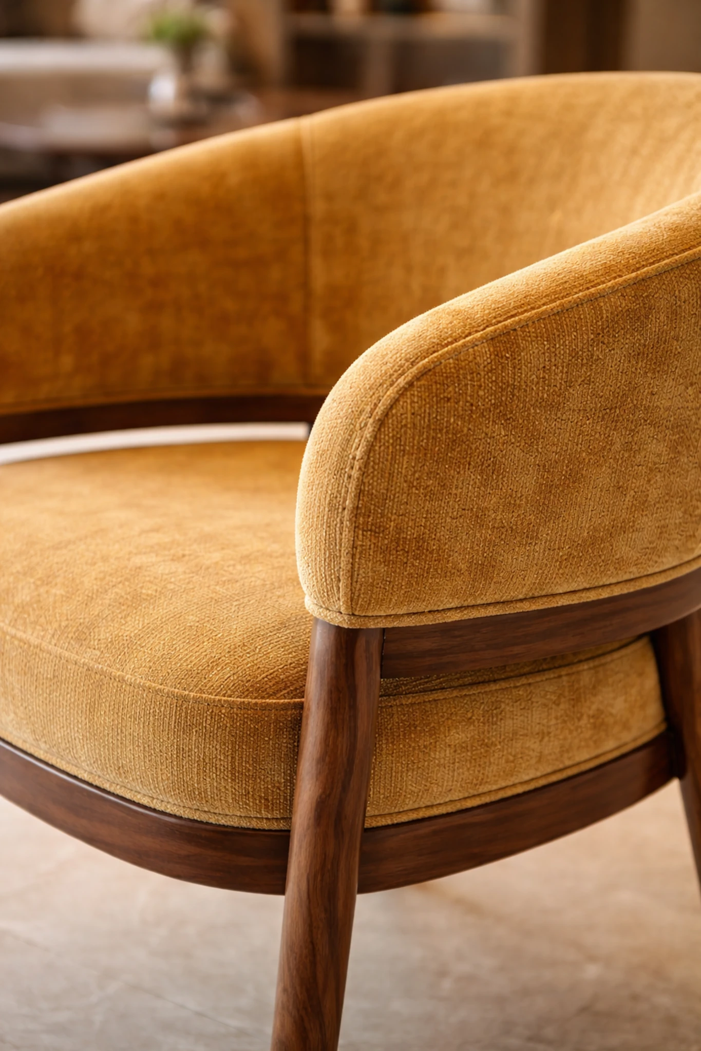 Upholstered in textured fabric, the seat and inner back provide comfort with quiet refinement. The exposed solid wood frame introduces warmth and structure, tracing a clear architectural line beneath the curved back. This interplay between softness and timber gives the piece clarity and depth from every angle.