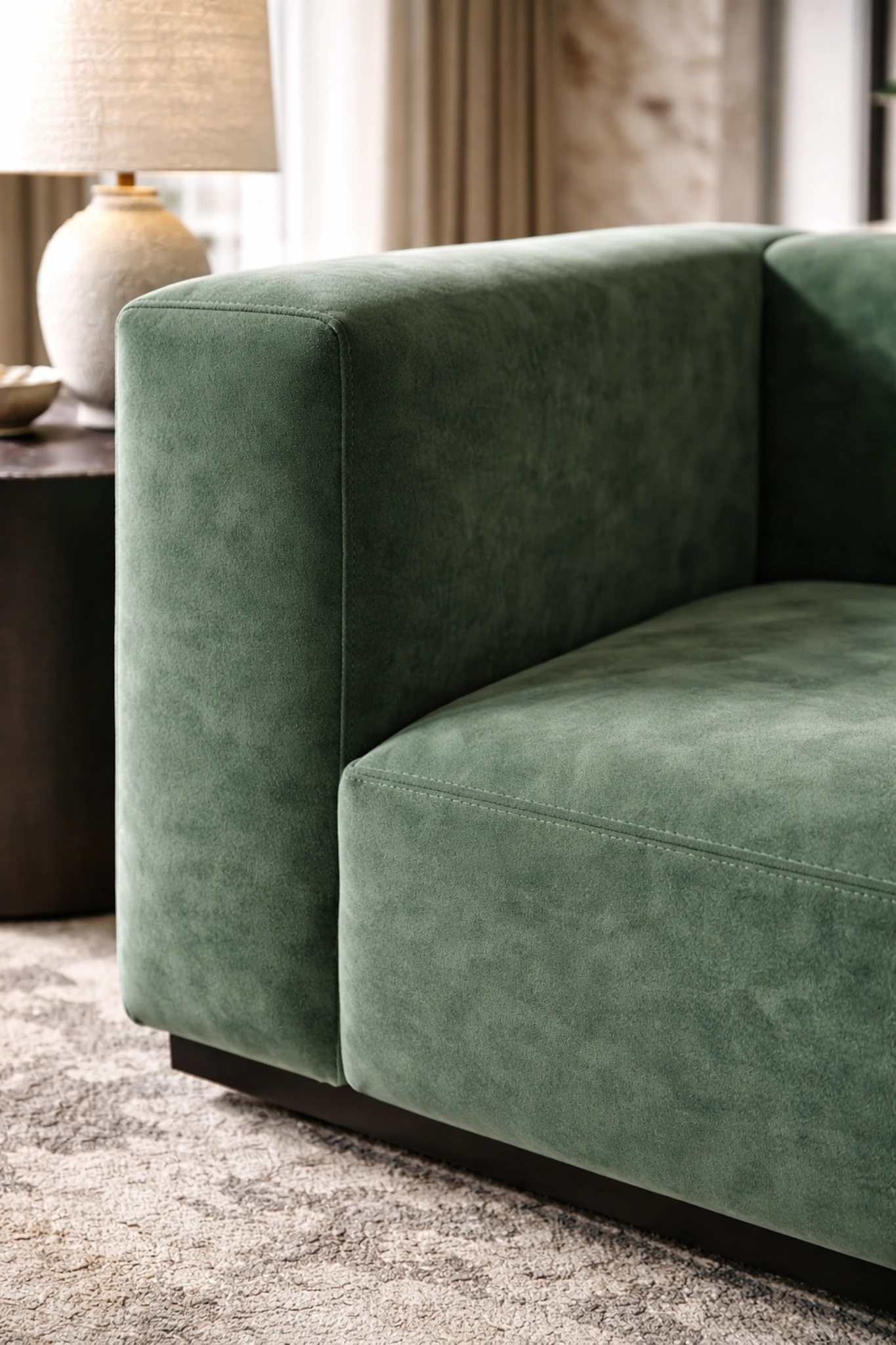 Upholstered in a rich green fabric, the Verd Sectional Sofa brings warmth and depth to the room while remaining restrained. The broad cushions and softly defined edges invite ease, while the continuous form keeps the overall look calm and architectural. Set on a discreet base, the sofa appears to sit close to the floor, reinforcing its grounded, contemporary character.