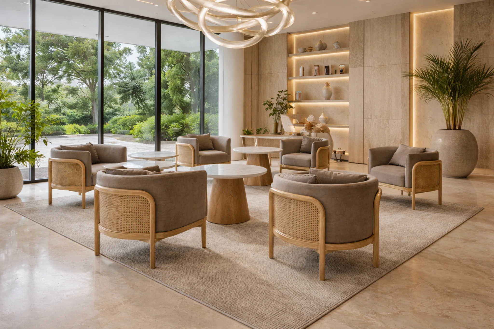 A generously cushioned seat sits within the frame, balancing support with ease. The contrast between the solid wood structure and the textured weave gives the chair clarity and warmth, allowing it to sit naturally in both residential and hospitality settings. The open back keeps the form visually light, making it well suited to larger lounge spaces without feeling bulky or enclosed.